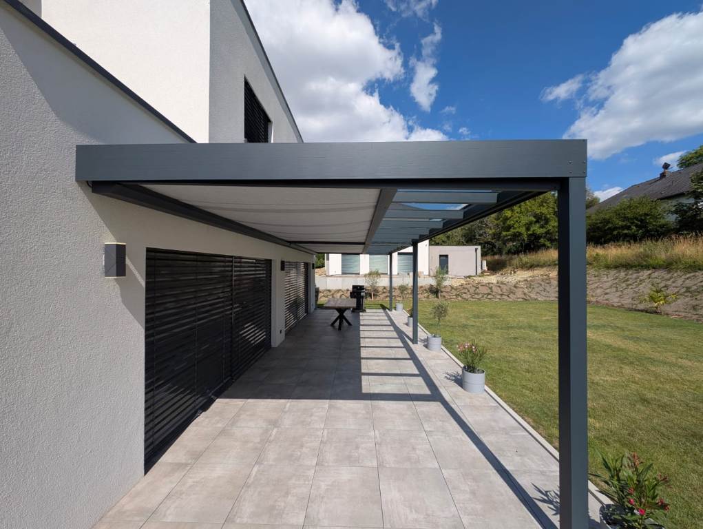- Konstruktion: Die Überdachungen bestehen aus pulverbeschichteten Aluminiumprofilen (Anthrazit, Alu-Silber, Sepia-Braun, Weiß) und **VSG- / ESG-Schiebeelementen**.